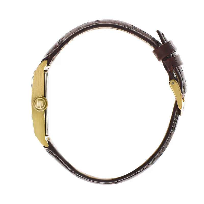 Este reloj LIP T18 es una reedición muy fiel del modelo T18 de la década de 1930 que se presentó a Winston Churchill. Equipado con una caja de acero inoxidable 316L chapada en oro, pulida y cepillada de 38,5 mm de largo y 21,2 mm de ancho, es ideal tanto para hombres como para mujeres. Su esfera dorada está cepillada vertical y horizontalmente, y cuenta con agujas Dauphine color pistola. Su correa de piel de vacuno marrón estilo cocodrilo se cierra con una hebilla. El modelo icónico que conquista a todos.
