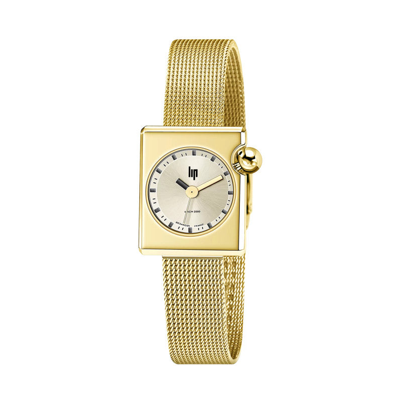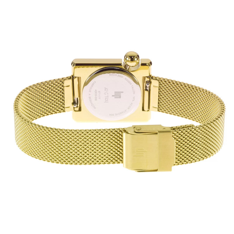 Esta elegante versión del Lip Mach 2000 mini cuadrado incluye una pulsera ajustable de eslabones milaneses de oro. El Marquise Gold se ha transformado en un refinado reloj joya. De día o de noche, sus finas y elegantes líneas asimétricas y su esfera con dos agujas doradas, excepto la de las horas negra, lo convierten en un reloj sumamente femenino para cada momento. Su pulsera de malla milanesa se puede cambiar fácilmente a mano, sin necesidad de herramientas, para que puedas personalizar tu reloj a tu gusto.