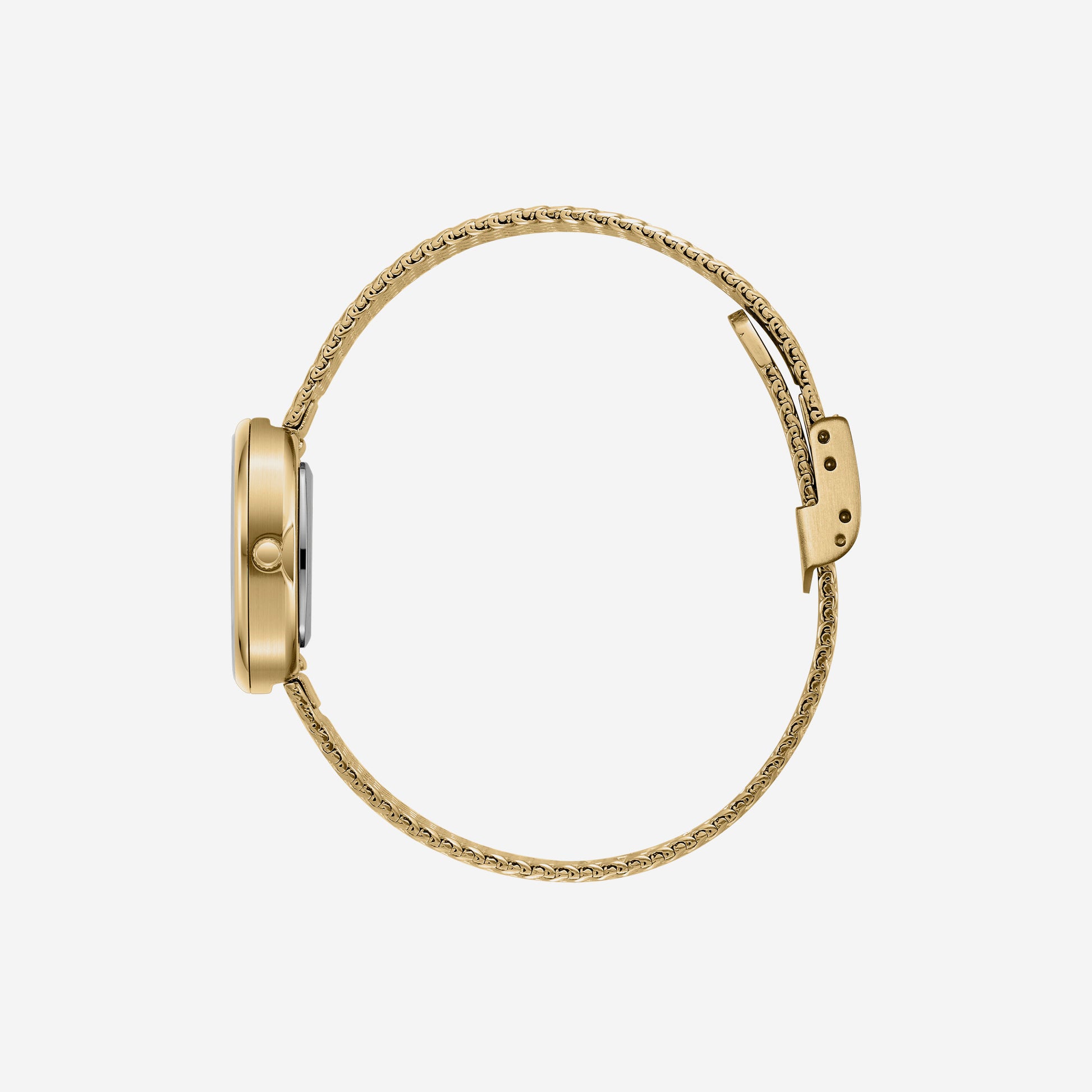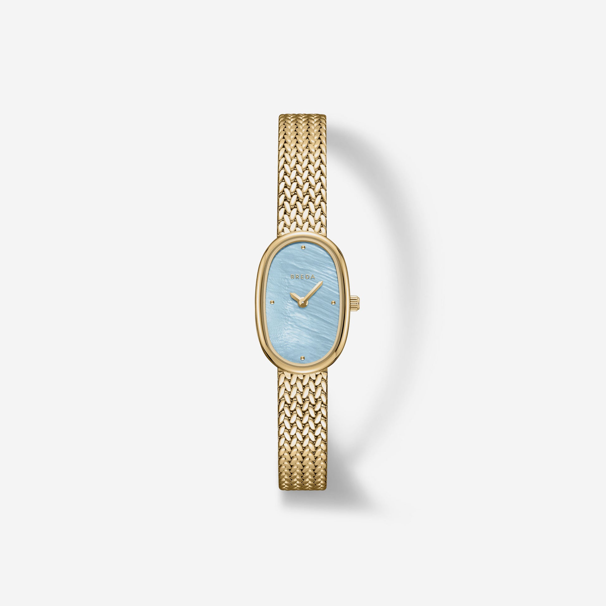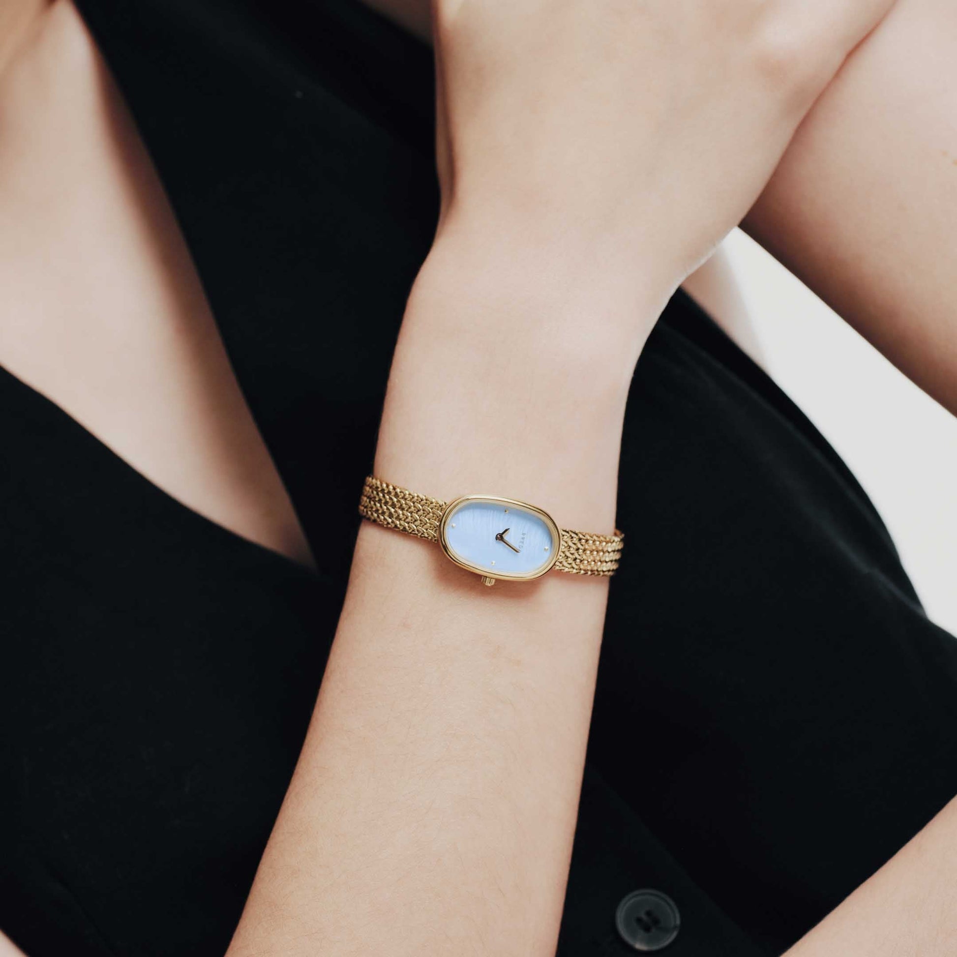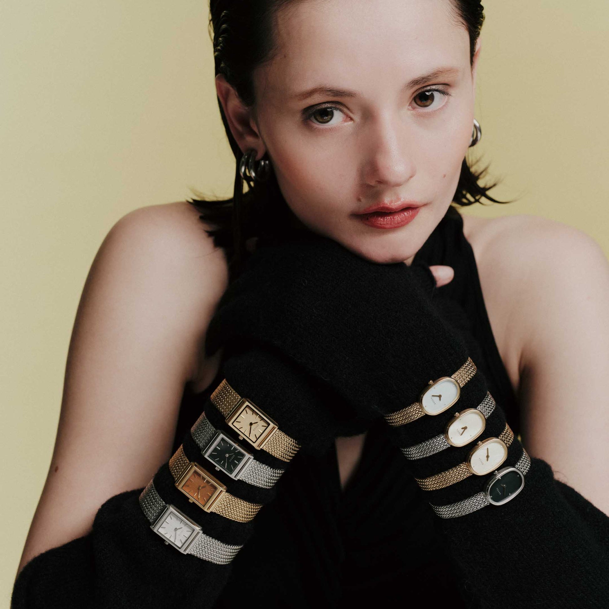 La colección Malla existe como un recordatorio diario de nuestra conexión humana y nuestros recuerdos compartidos entrelazados, colapsando sin cesar. El Jane (Malla) lleva una delicada caja ovalada de 18 mm, una esfera de nácar perleado y un brazalete de malla tejida ahusado que se cierra con un cierre de liberación rápida.